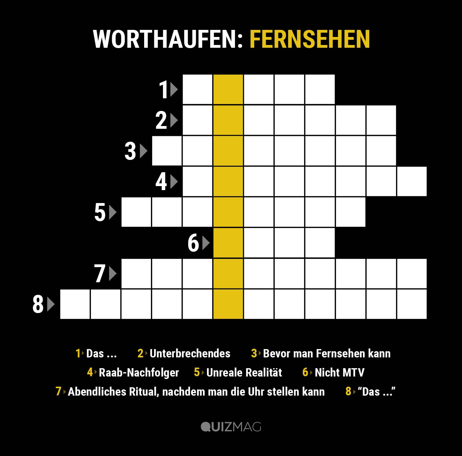 Worthaufen Nummer Fünf! Nein, diese Ausgabe ist nicht mit der TV-Serien-Variante zu verwechseln, hier geht es nämlich um alles andere, was im Fernsehen so (oft vergebens) auf uns wartet. Mal sehr direkt und einfach erfragt, mal um die Ecke gedacht. Wie lautet das gesuchte Senkrechtwort?